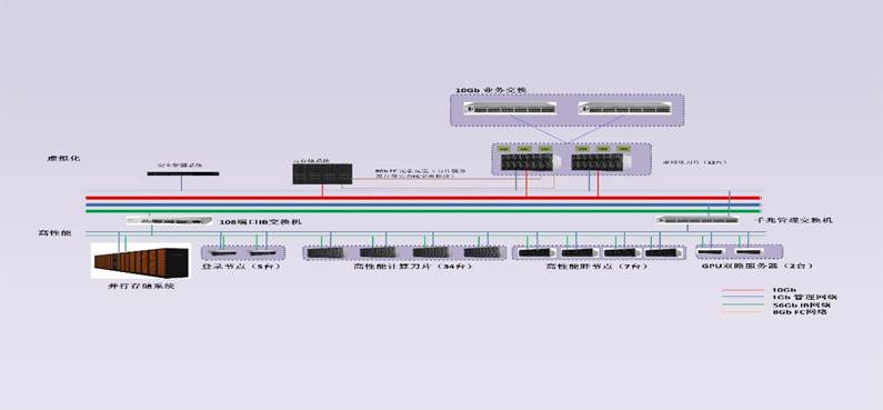 目前,整个高性能计算系统共有计算节点48台,由34台双路计算节点、7台四路胖节点、2台GPU计算节点、5台双路登录、管理节点组成,提供不少于63.21TFLOPS的双精度理论峰值计算能力、不少于192TB裸容量和聚合带宽不少于10 GB/s的分布式并行存储系统。集群系统登录和管理系统由5台双路节点构成,使用56Gb/s FDR InfiniBand交换机组建低延迟高速网络,使用48端口千兆交换机组建集群系统管理网络。高性能计算平台集群系统软件包括集群管理系统,提供系统监控、管理、告警、统计、作业调度等功能和组件;以及其它相关的HPC开发和编译运行环境,可支持跨学科的专业计算软件的运行需要。